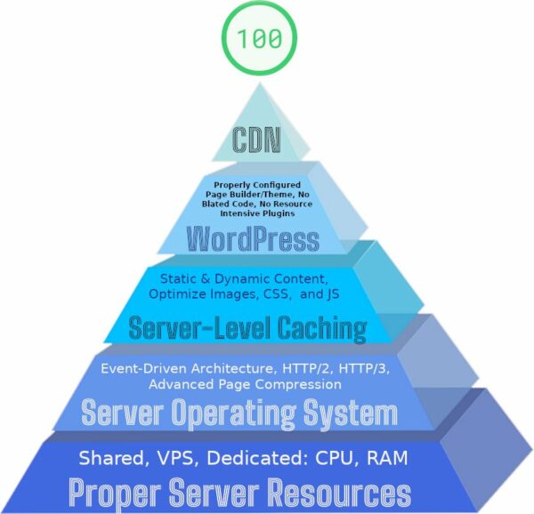 When we delevop your site, speed optimization is included at no additional charge! The pyramid depicted above illustrates the structured approach we adhere to when developing your website. Each phase is carried out with precision to guarantee that your website is delivered with optimal performance. In instances where we are tasked with optimizing a site that we did not create, we meticulously review each layer of the pyramid. This involves assessing the foundation to confirm that your hosting package offers the essential resources. With LSCWP managing image optimization and generating critical CSS for individual URLs, it is imperative to ensure adequate disk space and inode availability.